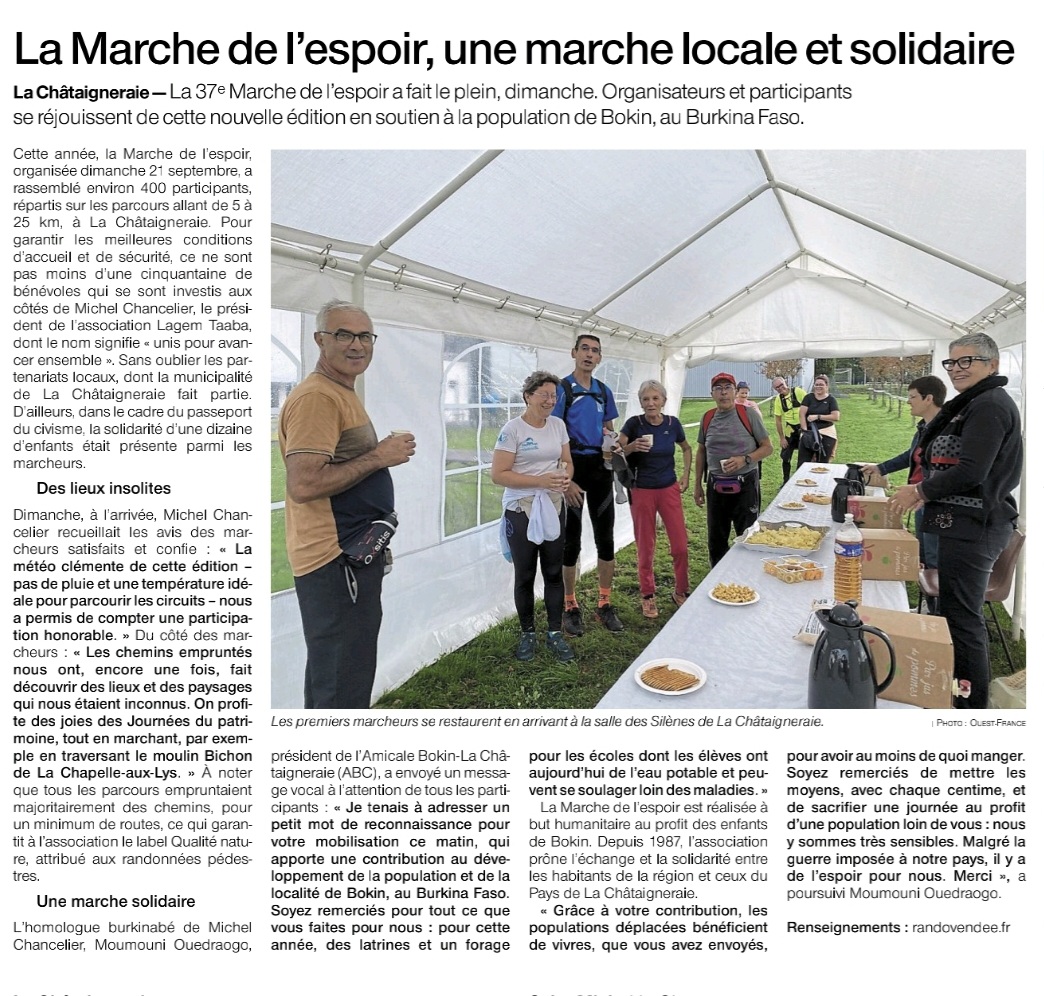 Cette année, la Marche de l’espoir, organisée dimanche 21 septembre, a rassemblé environ 400 participants, répartis sur les parcours allant de 5 à 25 km, à La Châtaigneraie. Pour garantir les meilleures conditions d’accueil et de sécurité, ce ne sont pas moins d’une cinquantaine bénévoles qui se sont investis aux côtés de Michel Chancelier, le prési dent de l’association Lagem Taaba dont le nom signifie « unis pour avancer ensemble ». Sans oublier les partenariats locaux, dont la municipalité de La Châtaigneraie fait partie D’ailleurs, dans le cadre du passeport du civisme, la solidarité d’une dizaine d’enfants était présente parmi les marcheurs.